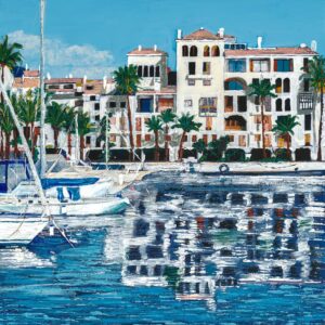 I flew to Gibraltar and enjoyed exploring the very peaceful (in March) Costa del Sol coastline and over the Gibraltar straits to Ceuta. It was fantastic, the only hint of a global pandemic being the odd message on my phone. When I returned I was inspired to paint during lockdown! I remembered feeling so relaxed in Estepona marina as I sat with my new found friends having a beer in the marina bar and this painting takes me back there.