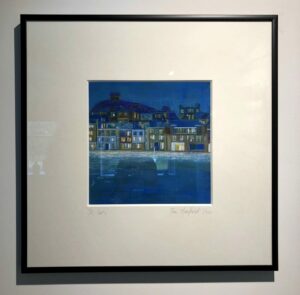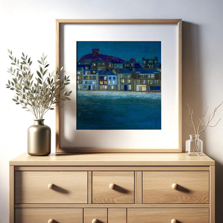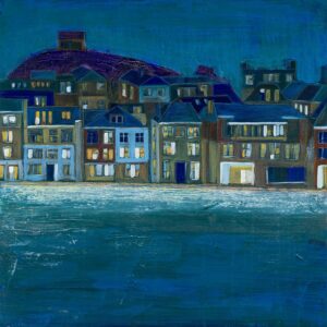 This painting shows a view of the seaside town of St Ives at night. For those who like to name the Cornish sights, it shows Harbour Beach and the buildings on The Wharf. St Nicholas’ Chapel can be seen in the background.